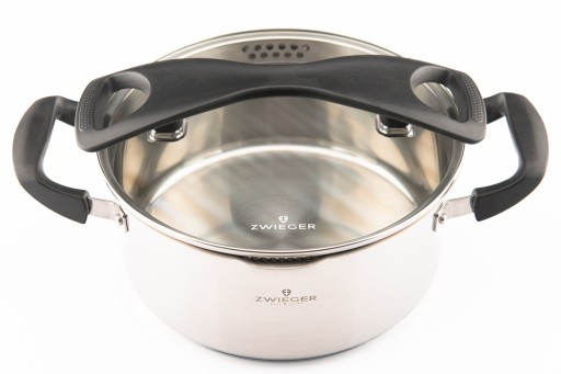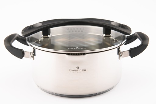 - System do odcedzania potrawy - idealnie dopasowana, wykonana ze szkła hartowanego pokrywa, posiadająca wewnętrzny kołnierz z dwoma profilami do odcedzania cieczy oraz uchwyty, umiejscowione na pokrywie i garnku, pozwalają wygodnie, szybko, bezpiecznie i bez wysiłku odcedzić zawartość naczynia