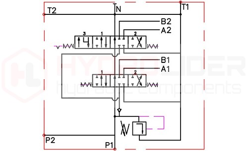 - Rozdzielacz hydrauliczny 2-sekcyjny 40 l/min z jedną sekcją pływającą i pozycjonowaniem sprężynowym.