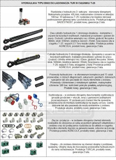 Zestaw jest sprawdzony, wielokrotnie montowany na ładowaczu w ciągniku T-25. Zestaw nie wymaga demontowania starego rozdzielacza, czyli tylny podnośnik i kipowanie będzie działać po staremu.