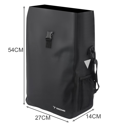 - SPECYFIKACJA - materiał: PVC + poliester, pozostałe: nylon + żelazo + PP + POM + eko skóra; pojemność zamkniętej ok.: 15l; pojemność otwartej ok.: 20 l; montaż: na bagażnik; odblaski: tak; komora:1; kieszeń: 1; wymiary: 54 x 27 x 14 cm; waga: 542 g; waga w opakowaniu: 558 g