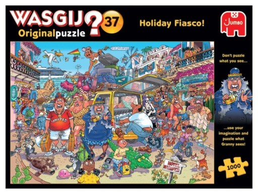 ‘Holiday Fiasco!’ is the title of this hilarious Wasgij Original 37, 1000-piece puzzle which introduces puzzlers to a family of tourists that have arrived at their destination for a holiday filled with sun, sea and sangria, but their magnificent resort isn’t quite how it looked in the brochures. Granny has spotted something that has left her so shocked she almost dropped her sunscreen, and it’s not just the price of drinks! What could have ruined Granny’s holiday before it’s even started? That is the image you need to puzzle. Wasgij Original is the puzzle concept where you must use your imagination and clues provided to piece together not what you see on the box, but what the people on the box see!