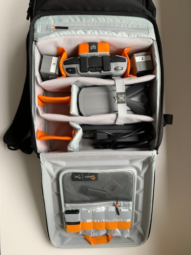 - plecak na drona DJI Mavic Pro, kontroler, do 5 zapasowych akumulatorów, laptop 15 cali, tablet 10 cali, duży smartfon, DJI Osmo lub 2 GoPro i bezlusterkowca, kable, butelkę wody, przekąski i inne drobne akcesoria,