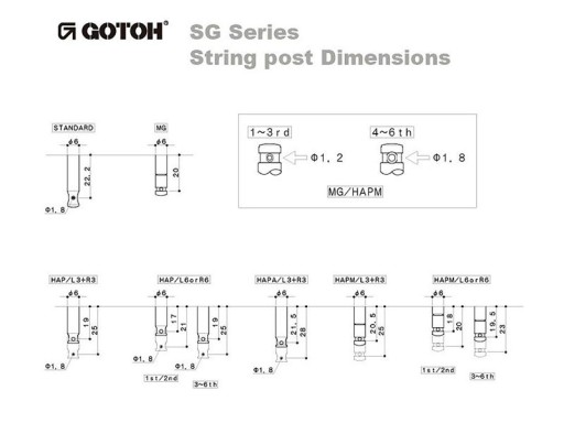 GOTOH GUT Co. to jedyny japoński producent części do instrumentów strunowych, którego początki sięgają 1960 roku. Od tego czasu jest wiodącym producentem najwyższej klasy osprzętu gitarowego, cenionego przez największych producentów gitar (Fender, Gibson, Ibanez, ESP) oraz najwybitniejszych lutników. Seria SG381 to najbardziej popularna linia firmy GOTOH. Najczęściej wykorzystywany standard z jedną śrubką (45st.) Seria tradycyjnie oferuje kilka opcji trzpieni od standardowych, z regulowaną wysokością ,blokowanych aż do kombinacji dwóch ostatnich o nazwie HAPM. Do wyboru wiele wersji pokrętła i wykończenia. Bardzo dobra jakość, precyzja wykonania i gwarancja stabilnego stroju.