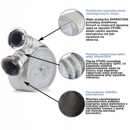 Węże strażackie BARRACUDA posiadają dodatkowy fartuch w miejscach łączenia węża ze złączem STORZ, dzięki czemu warstwa zewnętrzna nie jest narażona na obtarcia.