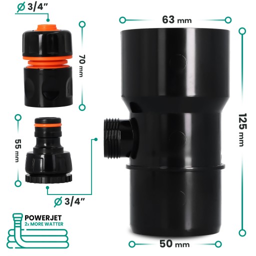 Odzyskiwacz wody deszczowej 63 mm x 3/4'' GZ czarny z przyłączem pod szybkozłączke 3/4'' GW x SZ PowerJet i szybkozłączka 3/4'' W x SZ PowerJet