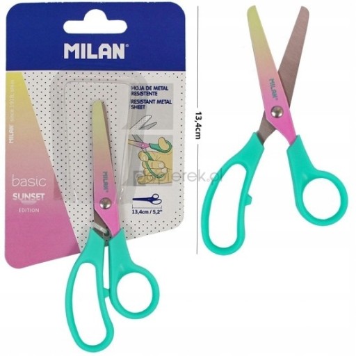 Nożyczki szkolne BASIC SUNSET z kolorowym ostrzem i plastikową żółtą rączką. Długość 13,3 cm. Ostrze ze stali nierdzewnej z zaokrągloną końcówką. Idealne do użytku szkolnego. Oryginalny produkt stworzony przez własny dział badawczo-rozwojowy MILAN.