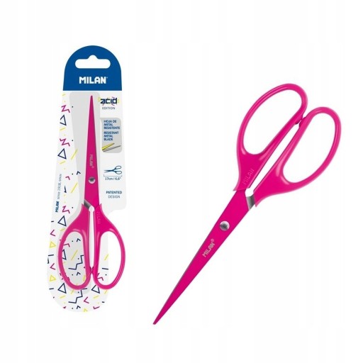 Nożyczki biurowe z serii ACID z ostrzem tego samego koloru co rączka. Długość 17 cm. Ostrze ze stali nierdzewnej z zaostrzoną końcówką, która umożliwia większą precyzję cięcia, nawet drobnych elementów. Symetryczny plastikowy uchwyt, odpowiedni również dla leworęcznych. Oryginalny produkt stworzony przez własny dział badawczo-rozwojowy MILAN.