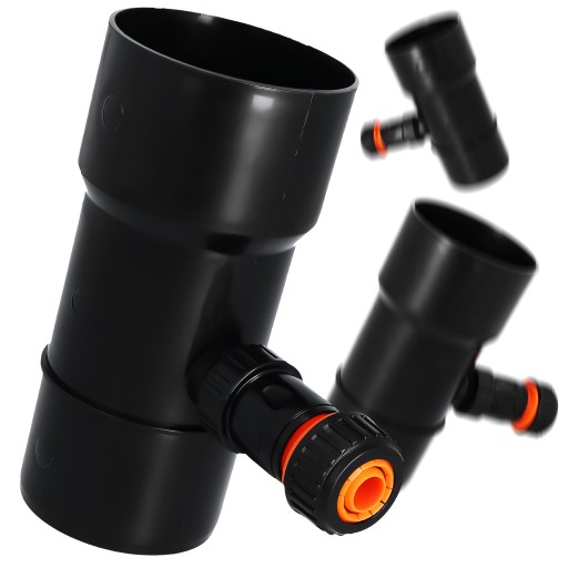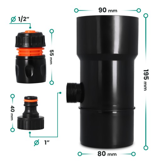 Odzyskiwacz wody deszczowej 90 mm x 1'' GZ czarny z przyłączem pod szybkozłączke 1'' GW x SZ i szybkozłączka 1/2'' W x SZ