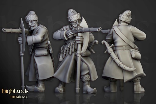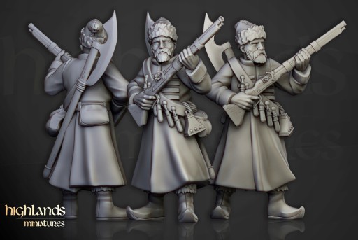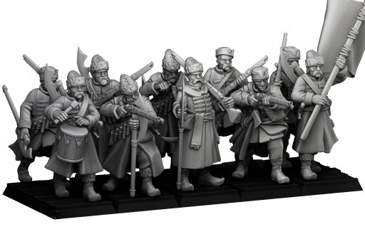 Przedmiotem oferty jest zestaw dziesięciu modeli Harbor Streltsy od Highlands Miniatures, wydrukowanych na drukarce 3D w technologii SLA.