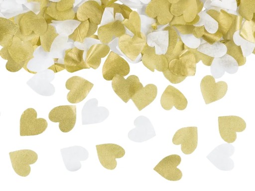 Tuba manualna z konfetti bibułowym w kształcie serc w kolorze białym i złotym, długość ok. 35 cm.