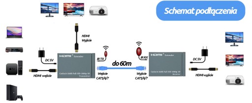 Podłączenie konwertera HDMI na LAN jest w tym przypadku bardzo łatwe. W zasadzie wystarczy podłączyć wejściowe HDMI np. z Laptopa, DVD, konsoli etc. do nadajnika (Transmitter), urządzenie wyjściowe takie jak monitor, projektor, telewizor podłączyć do odbiornika (Receiver). Następnie należy podłączyć oba urządzenia ( nadajnik oraz transmiter) ze sobą za pomocą kabla LAN w zależności od preferencji oraz podłączyć zasilanie ( zasilacze w komplecie). Aby w pełni cieszyć się transmisją HDMI na dużą odległość, możemy również wykorzystać transmitery IR (również znajdują się w zestawie). Co ciekawe nadajnik posiada przelotkę HDMI, dzięki której możemy podłączyć dodatkowy odbiornik za pomocą zwykłego kabla HDMI.