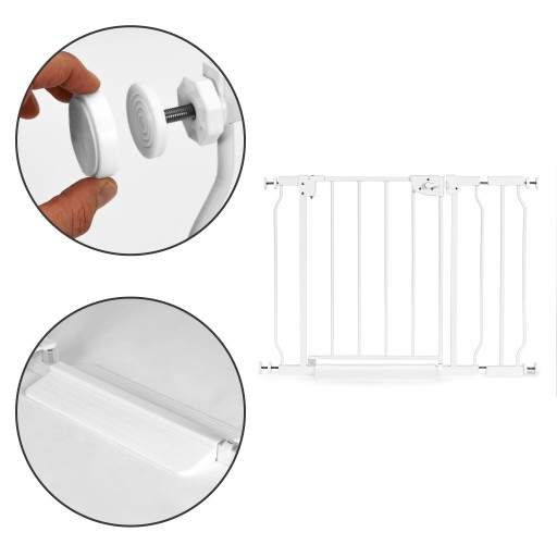 W komplecie z bramką znajduje się dodatkowy panel z dwoma szczebelkami, dzięki niemu bez problemu dopasujesz rozmiar konstrukcji do miejsca montażu. Dodatkowy panel łączony jest z bramką za pomocą metalowych trzpieni, dzięki niemu rozszerzysz ją o 12 cm.