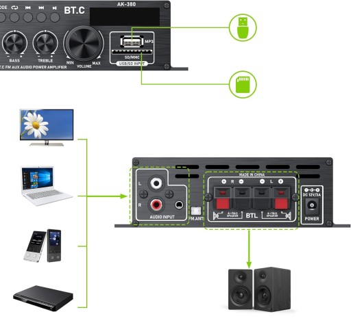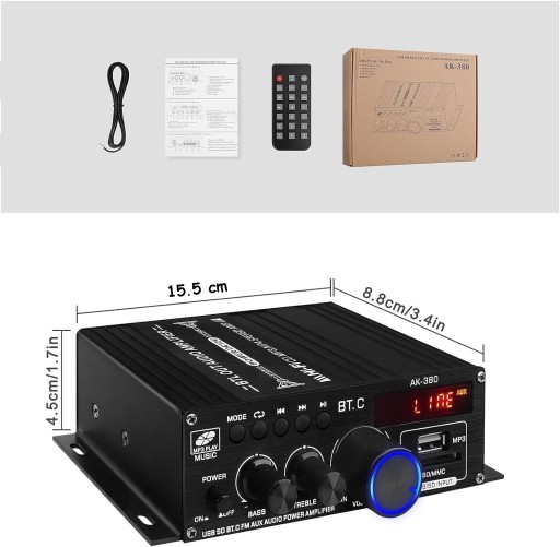 HIFI УСИЛИТЕЛЬ AK-380 40 Вт BLUETOOTH 5, ПРИЕМНИК 2.0 КАНАЛА, ДЛЯ АВТОМОБИЛЯ