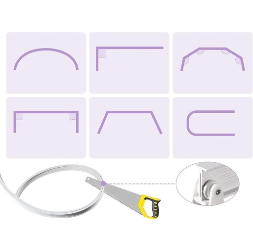 Plastikowy karnisz został zaprojektowany tak, aby był miękki, mógł się zginać i skręcać, aby pasował do różnych rozmiarów zasłon, bez względu na to, jak ostre lub wąskie są kąty, ale bez potrzeby stosowania specjalnych narzędzi;