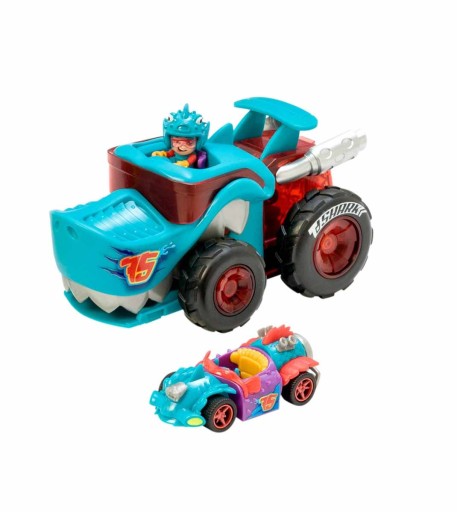 Włóż auto T-Racer do paszczy drapieżnika, naciśnij przycisk i rozpocznij wyścig z ogromną prędkością! Niech wygra najszybszy i najbardziej nieokiełznany pojazd!