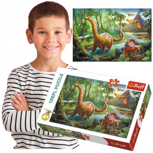Puzzle 60 elementów z dinozaurami Po ułożeniu powstanie obrazek o wymiarach 33x22cm. Wysoką jakość, nasycenie kolorów i bezpieczeństwo układania zapewnia kalandrowany papier odbijający światło, pokryty ekologicznymi farbami spożywczymi.