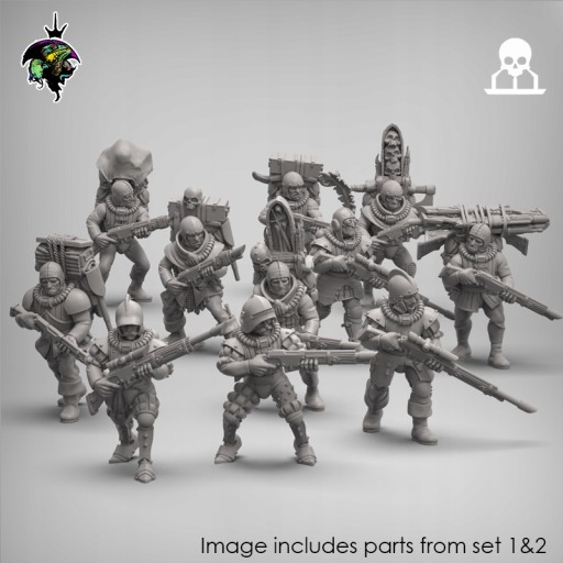 Przedmiotem oferty jest zestaw dodatkowych elementów do zestawów Mercenaries and Militia 1 oraz 2 od Reptilian Overlords, wydrukowany na drukarce 3D w technologii SLA.