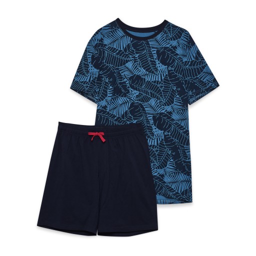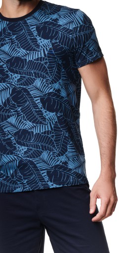 Henderson Arcade to piżama męska wykonana z wysokogatunkowej bawełny 100%, która gwarantuje jakość i swobodę użytkowania, a także wygodę podczas snu. Wykorzystana bawełna jest miękką i elastyczną tkaniną, która zapewnia komfort nawet przy długotrwałym użytkowaniu, nie ogranicza ruchów oraz nie uciska ciała. Komplet składa się z niebieskiej koszulki z nadrukiem liści oraz granatowych spodenek ze sznurkiem w pasie.