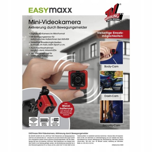 W przypadku aktywności minikamera wideo „EASYmaxx” jest natychmiast rejestrowana za pomocą czujnika ruchu i zapisuje wszystko w najlepszej jakości obrazu - wraz z dźwiękiem, a dzięki diodom na podczerwień nawet nocą!