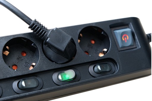 Przedłużacz zasilający marki BRENNENSTUHL. Posiada 6 gniazd typu SCHUKO, przy czym każde z nich posiada indywidualny przełącznik dwubiegunowy włącz / wyłącz, oraz kabel o długości 2m