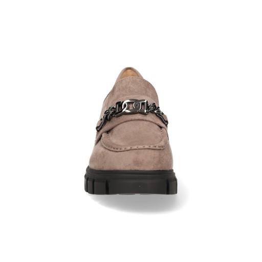 Mokasyny damskie wykonane z eko zamszu. Osadzone na masywnym obcasie. Model ten posiada miękką, skórzaną wkładkę, która zapewni wygodę podczas noszenia. Przód ozdobiony łańcuszkiem. Noski zaokrąglone. Ten modny fason koniecznie powinien znaleźć się w Twojej wiosennej garderobie! Przy wyborze rozmiaru prosimy sugerować się tabelą rozmiarów.