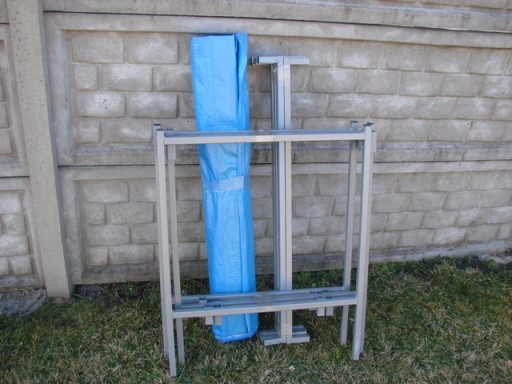 - Parametry po złożeniu stelaża, trzy ramki 77 x 56 x 8 cm i osiem łączników łączących 124 x 10 x 8 cm