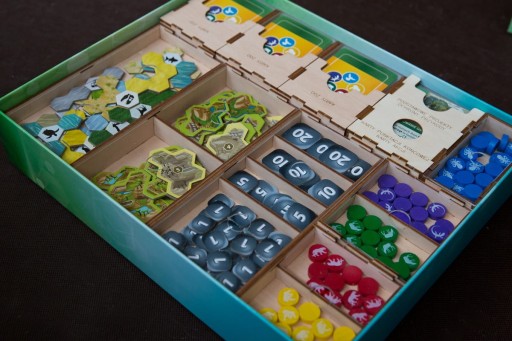 - pojemniki na kafle, żetony, drewniane znaczniki pełnią również funkcję tacek do wyłożenia na stół,