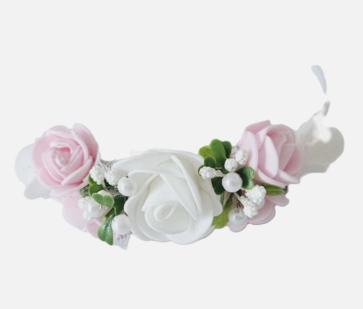 Opaska komunijna przyozdobiona kompozycją kwiatków i listków z koralikami.