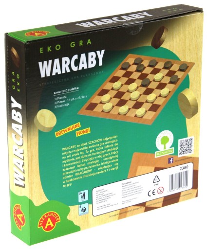 Eko Gra Warcaby to jedna z najstarszych i najbardziej cenionych na świecie gier strategicznych, wydana ze szczególną dbałością o środowisko. Nie zawiera plastikowych elementów. Poręczne pionki wykonane z drewna. Niefoliowana plansza oraz pudełko. Papierowa wypraska. Papier oraz drewno użyte w produkcji gry pochodzą ze sprawdzonych źródeł, które prowadzą zrównoważaną gospodarkę leśną, nie przyczyniając się tym samy do spadku ilości drzew w środowisku.Zawartość opakowania16 pionków z koloru, plansza, instrukcja