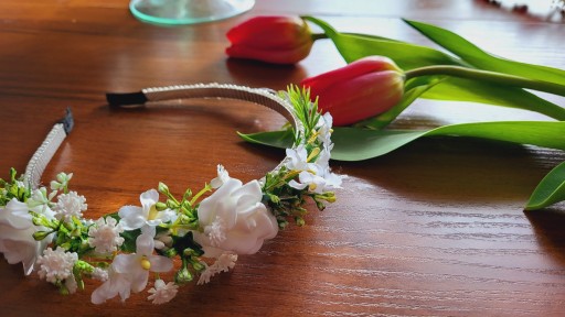 Opaska komunijna pięknie zdobiona kwiatami w kolorze bieli . To idealna ozdoba do włosów w kolorze bieli I zieleni . Może być wykorzystana na biały tydzień , lub na inne okazje niedzielę i święta.