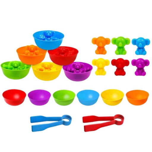 Zestaw zawiera figurki koali, które można sortować według liczby lub innego kryterium, rozwijając zdolności matematyczne i logiczne myślenie. Kolorowe miseczki oraz różnorodność figurek zachęcają dzieci do rozpoznawania i porównywania kolorów.