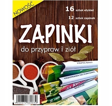 Cena za opakowanie 12 sztuk zapinek i 16 naklejek z nazwami przypraw.