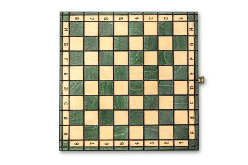 Komplet stanowi kaseta z planszą szachową, zestaw figur szachowych w kolorach białym i zielonym po 16 elementów w każdym.