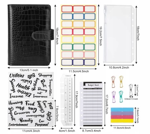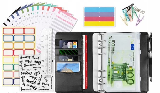 Oszczędnik planer budżetu finansowego A6 zestaw 37-elementowy oferuje również praktyczne dodatki, takie jak naklejki do oznaczania priorytetowych wydatków, notatki i cele finansowe.