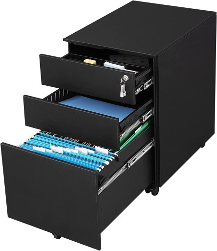 Przenośna szafka na dokumenty z 3 szufladami, zamykany stalowy cokół z szynami do zawieszania dokumentów, całkowicie zmontowany z wyjątkiem kółek, czarny OFC60BK