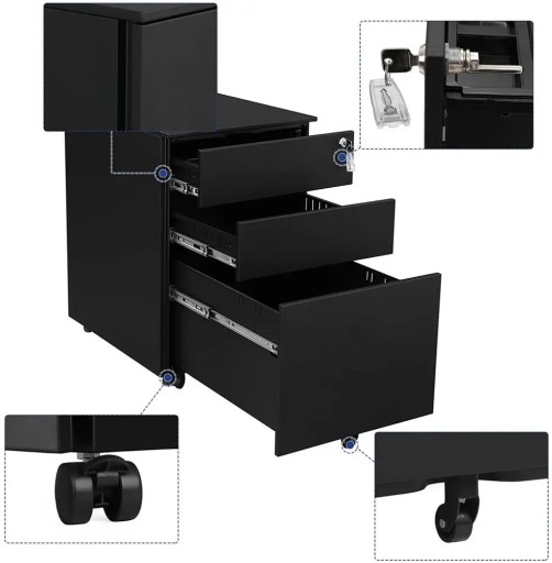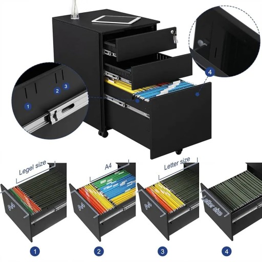 Przenośna szafka na dokumenty z 3 szufladami, zamykany stalowy cokół z szyn