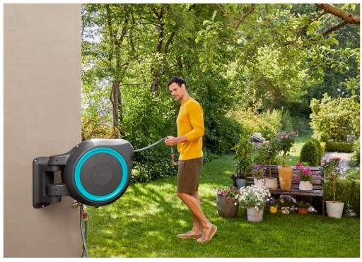 Bęben naścienny RollUp M/L 25 m marki Gardena sprawdzi się podczas nawadniania większych ogrodów. Oszczędza on czas na zwijanie i rozplątywanie węża oraz zapobiega brudzeniu się rąk. Technologia RollControl gwarantuje bezpieczny i kontrolowany proces nawijania. W zestawie znajduje się szybkozłączka i trzy przyłącza kranowe OGS, które umożliwiają przedłużenie węża i dołączanie do niego innych akcesoriów do nawadniania.