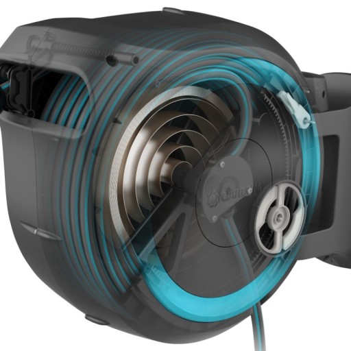 - Stalowa sprężyna wewnątrz bębna nawija wąż automatycznie, równomiernie i niezawodnie,