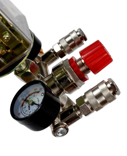 Wyłącznik posiada dwa szybko-złącza, dwa zegary oraz pokrętło do regulacji ciśnienia na wyjściu.