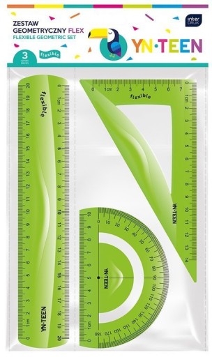 Supergiętkii odporny na złamania i uszkodzenia. W zestawie: linijka 20 cm, ekierka prostokątna i kątomierz. Dostępny w trzech opcjach kolorystycznych.
