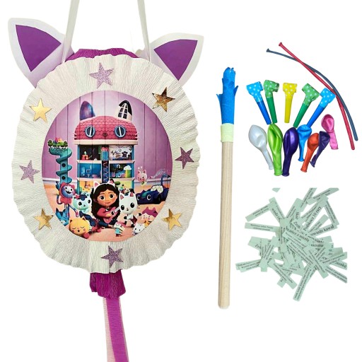- Zestaw piniata urodzinowa z motywem z bajki Koci Domek Gabi.