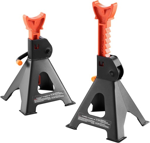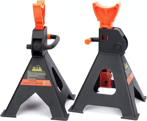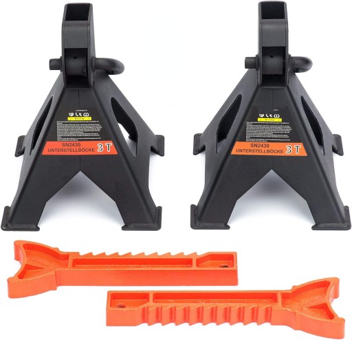 Komplet podstawek samochodowych 3T. Bardzo solidnie wykonane stojaki z grubej stalowej blachy z mechanizmem zapadkowym umożliwiającym bardzo precyzyjne ustawienie wysokości na wielu poziomach.