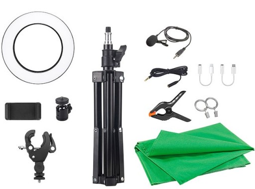 - Wyposażenie: Adapter, Klipsy, Oświetlenie pierścieniowe, Statyw z uchwytem do smartfona, Zielony ekran 2x3 m