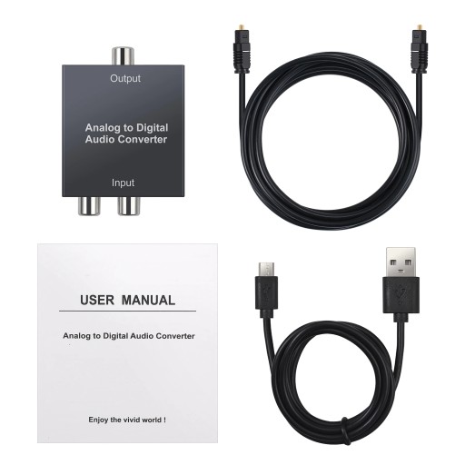 - Konwerter przeznaczony do konwersji sygnału analogowego audio z wejścia cinch/mini jack do cyfrowego TOSLINK/Coaxial