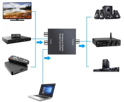 Konwerter pozwala na podłączenie kina domowego (oraz pozostałych urządzeń np. amplitunera, wieży HI-FI) z złączem typu TOSLINK lub COAXIAL do urządzeń takich jak telewizory, dekodery z wyjściem CHINCH (2xRCA) lub audio mini jack 3,5mm.