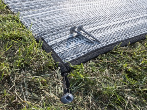 - Starannie obszyta, na rogach pętelki do przymocowania maty do podłoża za pomocą śledzi
