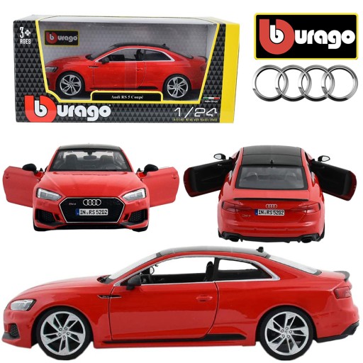 Model auta marki Audi RS 5 COUPE w kolorze czerwonym. Wyprodukowany na licencji przez znaną włoską firmę BBURAGO. Model w skali 1:24 wykonany z metalu z nielicznymi plastikowymi elementami. Drzwi w aucie są otwierane. Auto umieszczone jest na platformie i zapakowane w pudełko z szybką.
