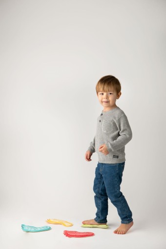 - woreczki sensoryczne, doskonalące umiejętności motoryczne poprzez chwytanie palcami stóp, rzucanie i podawanie, czy układanie wieży. Trzecią opcją jest nawiązanie do gry Twister, gdzie dziecko kładzie swoje dłonie i stopy na stópkach i dłoniach z zabawki.