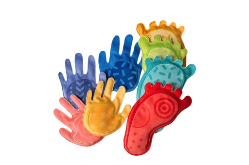 - 8 milutkich woreczków sensorycznych z różnymi wypełnieniami w kształcie stóp i dłoni