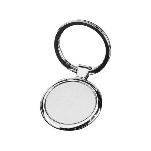 Okrągły brelok z chromowanego metalu. Matowa zawieszka będzie idealnym miejscem na Państwa logo, które umieścimy w postaci